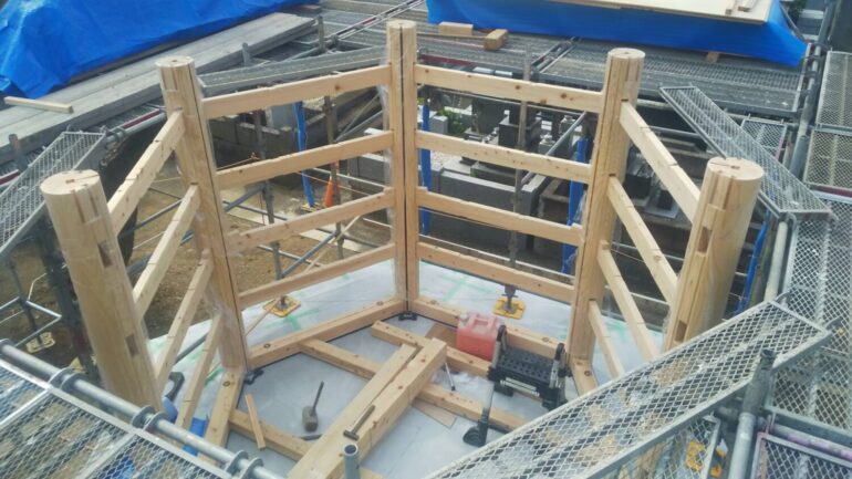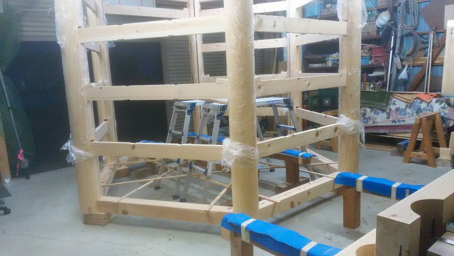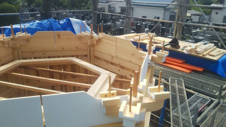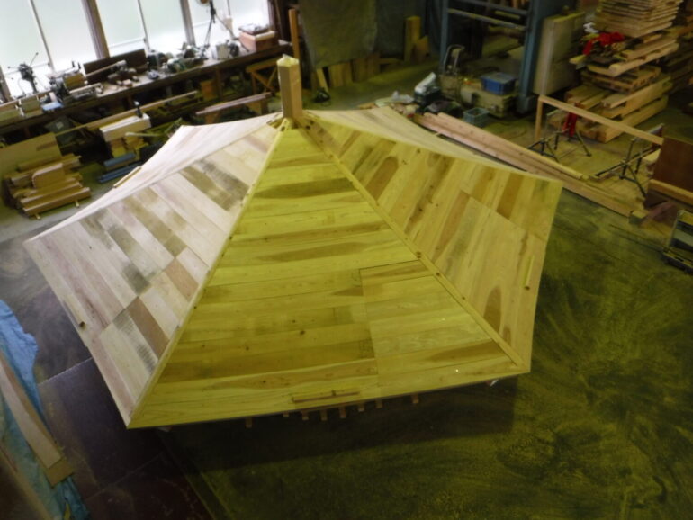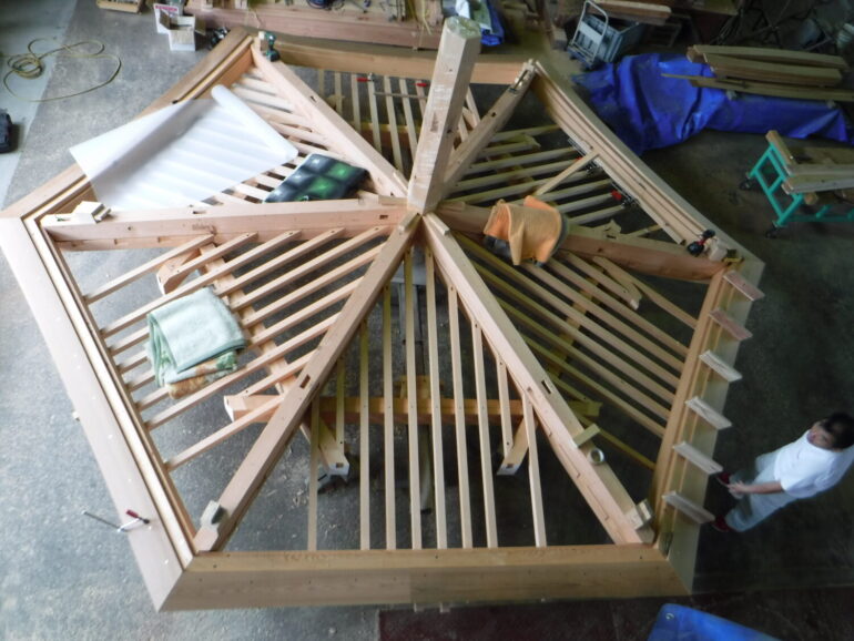 この規模のお堂であれば天峰作業場で仮組まで行い、いったん解体してキット化して運搬しますので