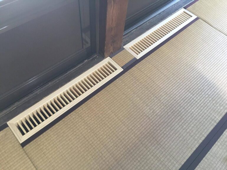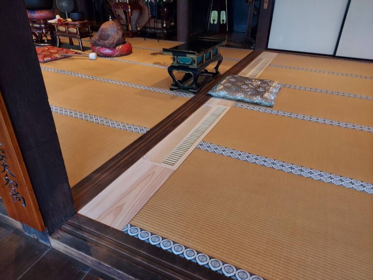 本堂床下へ機械本体を設置、ダクトで室内各所へ送り専用吹出し口から冷風を吹き上げるシステムです。静音に優れ、本堂内の景観を損ないません。