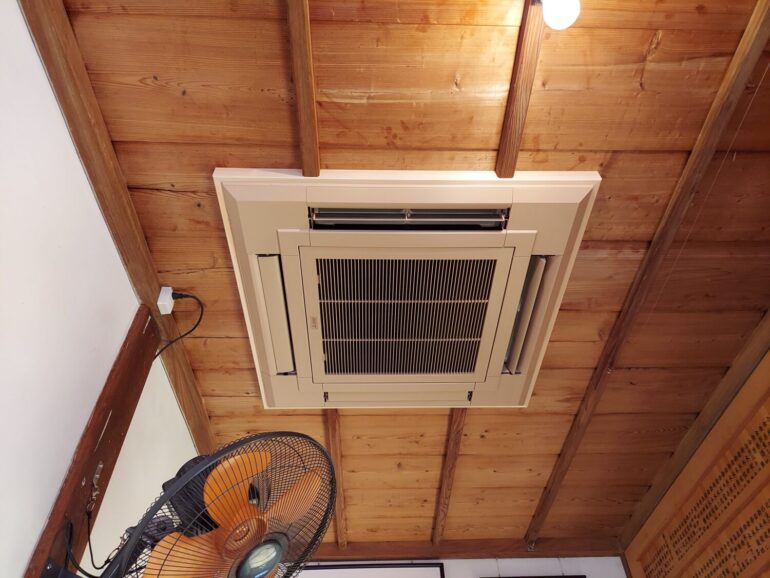 天井の加工は必要ですが、堂内空間はスッキリします。屋根裏の梁位置などに問題なければ馬力あるタイプも選べるため、冷房効果は抜群です。