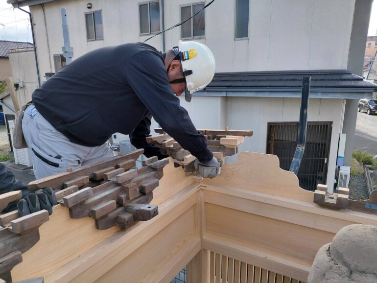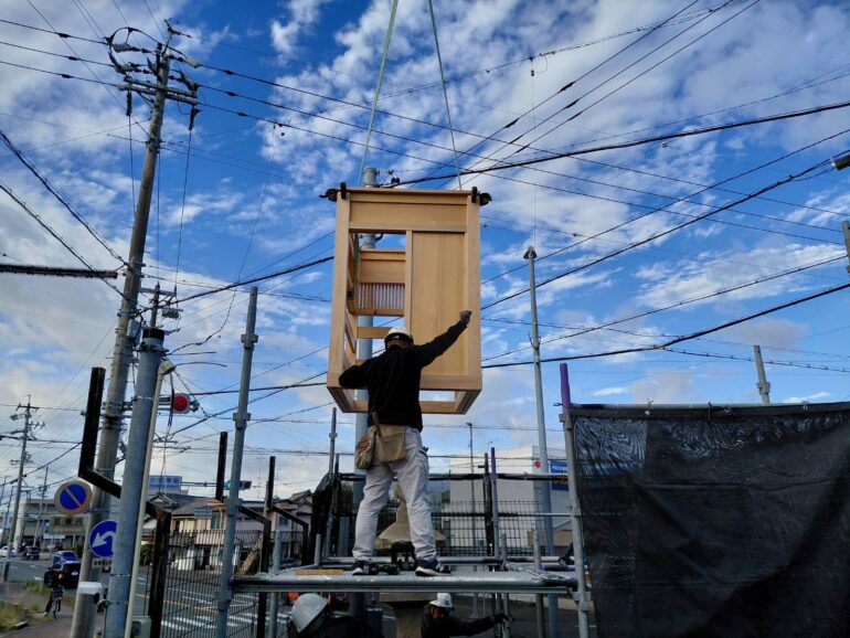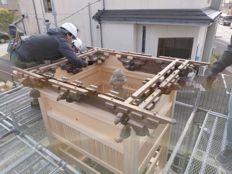 斗栱と板壁を組みながら設置して、最後に屋根をレッカーで吊って組立完了しました。