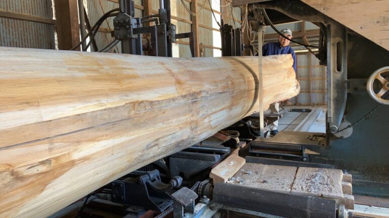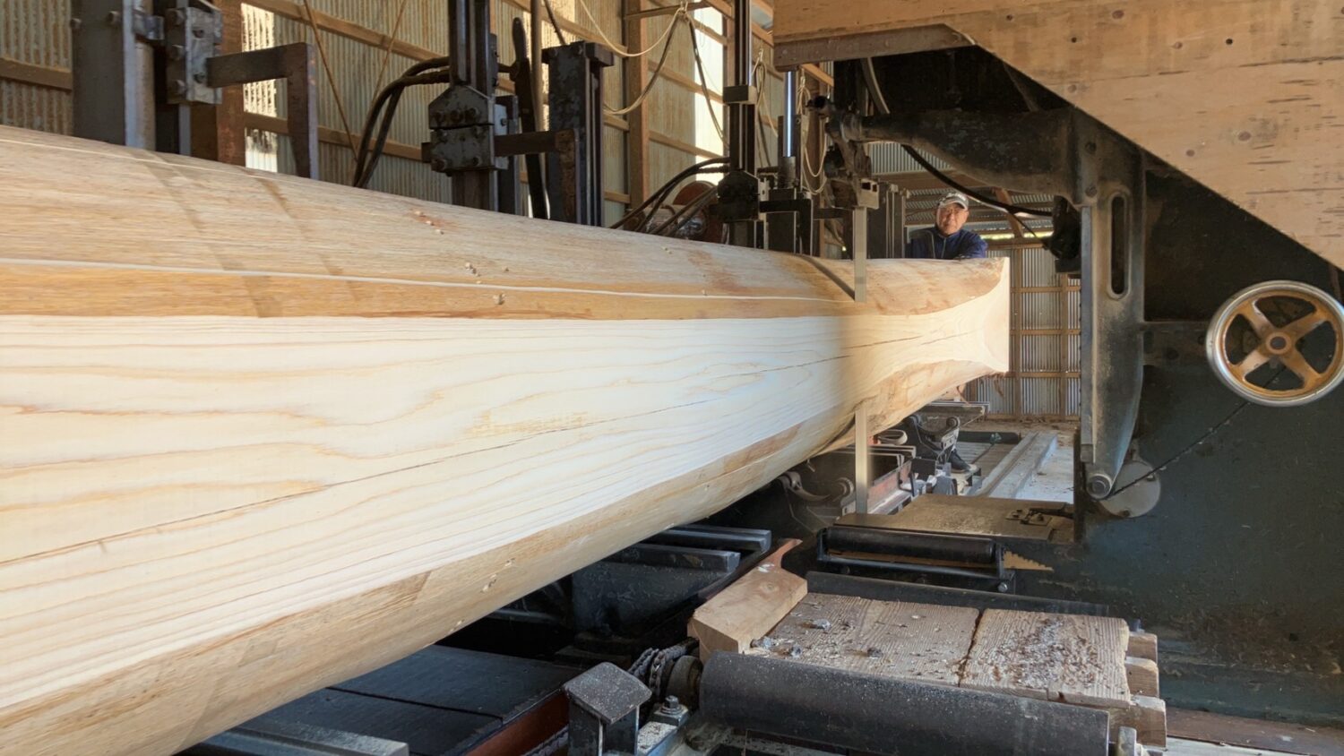 天峰ブログ 2025.12.17 天峰製材所では原木の製材が忙しい 天峰秋葉製材所では会長が製材仕事に勤しんでいます。 山では秋ぐちから伐採が始まり、仕入れた桧や杉の原木が製材所に運び込まれ、 一本一本忙しく製材をしています。 大きな丸太や長~い丸太もあるため、『 木 』を見ながら挽いていきます。 この材木が、実際に建物や山車に使われるのは数年後ですが、 自然乾燥させていつでも使用可能にしておくことは宮大工として段取り的に重要なことです。 平松 Tweet Share +1 RSS 天峰ブログ