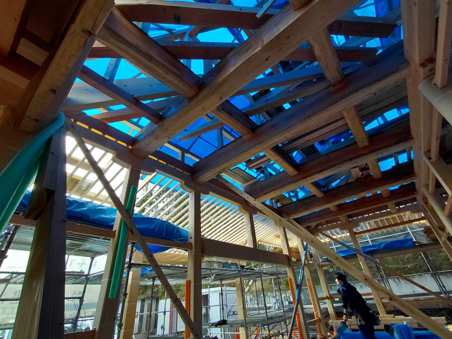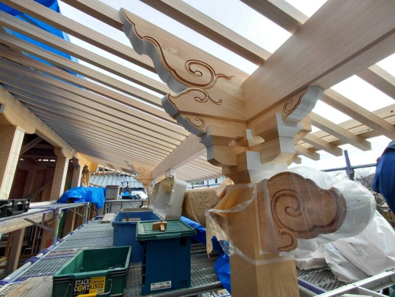 向拝の軒廻りもきれいに納まり、これから桔木を固定していき野地へ移っていきます。