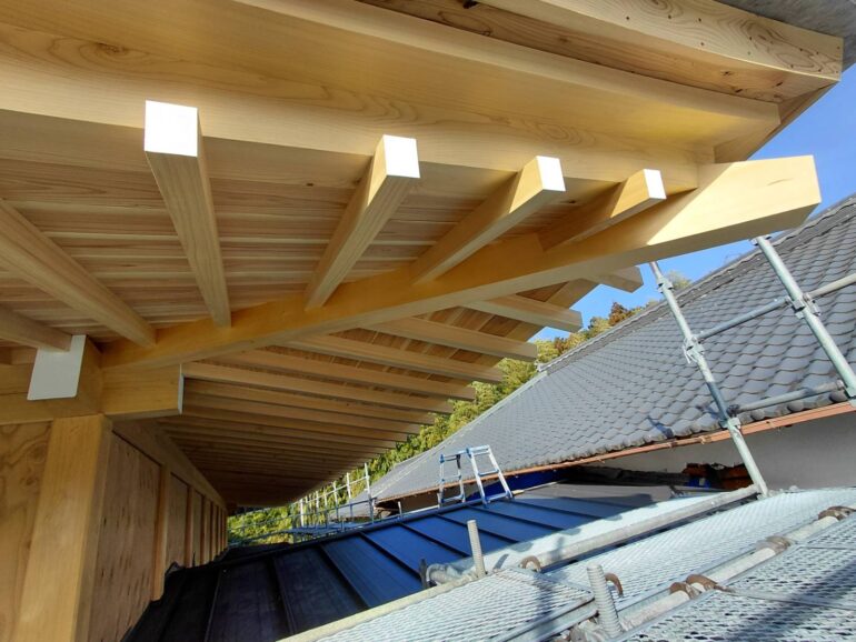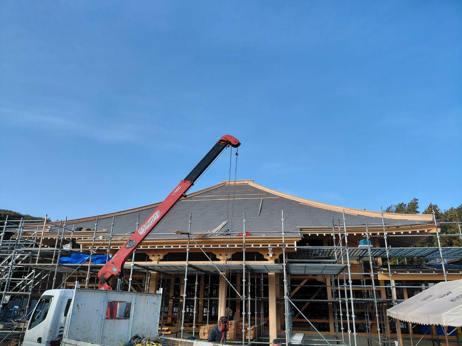 天峰ブログ 2026.02.09 興嶽寺様本堂は屋根下地が完成します 菊川市の興嶽寺様本堂新築工事では12月の建て方後から化粧軒廻りを進め、 野地工事がほぼ完了に近づいてきました。 防水ルーフィングは隅棟の下にもしっかり敷き込んだうえで箱棟下地を製作し、 万が一の雨漏り対策も確実に施工しています。 春に向かって徐々に雨も降る季節となりますので、屋根下地が完了しホッとしています。 屋根工事は今後板金屋さんにバトンタッチし、大工は床や壁などの造作工事に移っていきます。 引き続き安全第一で進めていきます。 小澤 Tweet Share +1 RSS 天峰ブログ