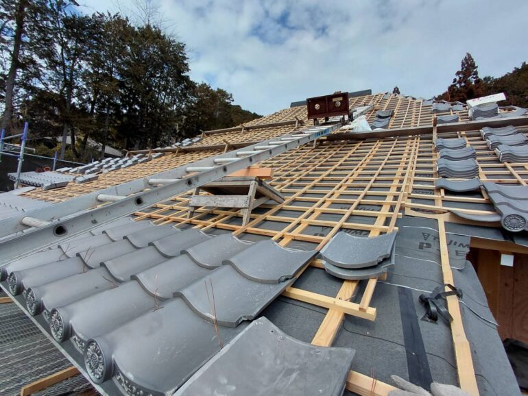 瓦職人さんは、大工の仕上げた下地の上に引っ掛け二重桟木を丁寧に取り付け、